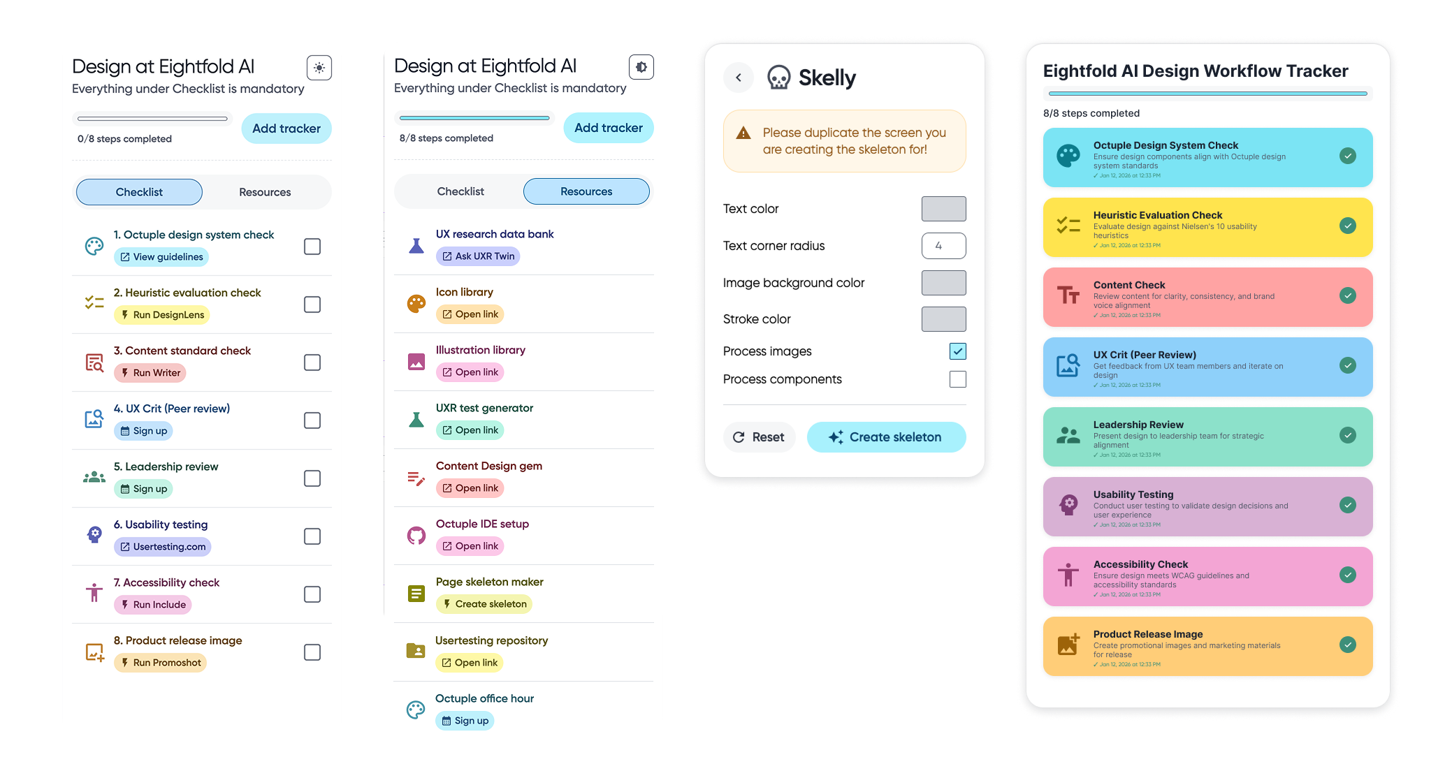 We have a small design team responsible for a few major products at Eightfold. The best way to deploy a design process for the team members to adopt is to be inside where they work. So, I created a Figma plugin for the team to be used internally to get all the resources and support they need, with the internal design process guide altogether in one place. This eliminate the need to switch between tools for the designers to accomplish their tasks. I used Cursor to build this plugin and deployed it internally.